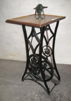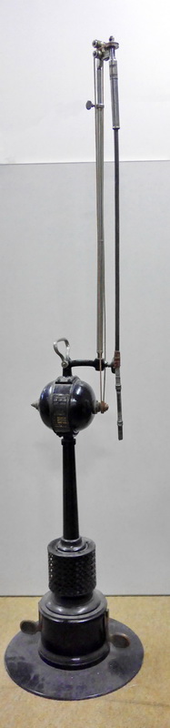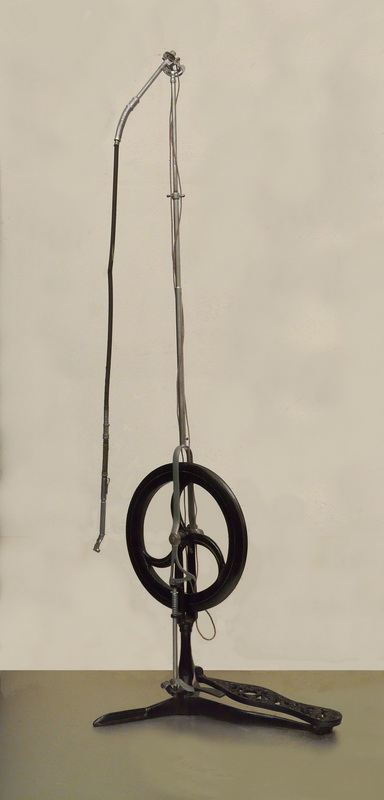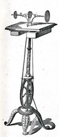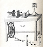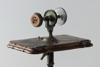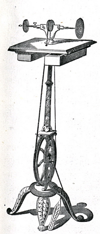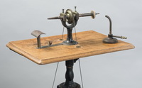 Tour à pédale de cabinet pour prothèses. Sa table de travail en bois avec sa roue supérieure, avec son axe pour y mettre différentes brosses et meules, sa cheville et un bec bunsen, 1850-1880