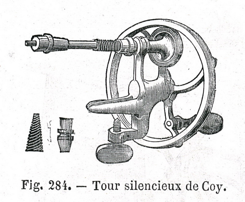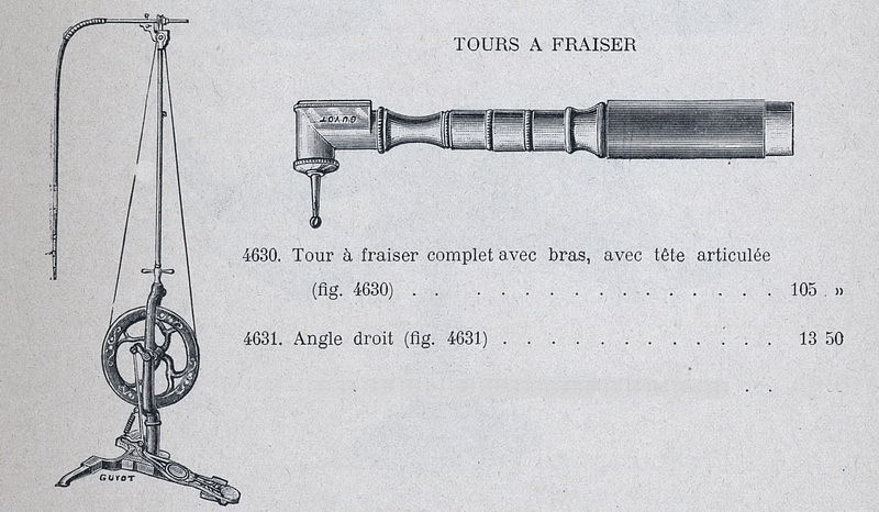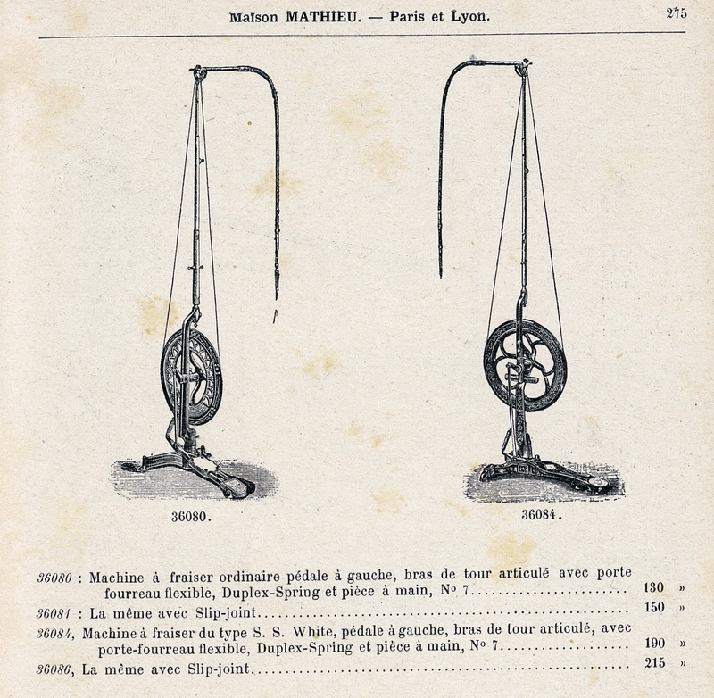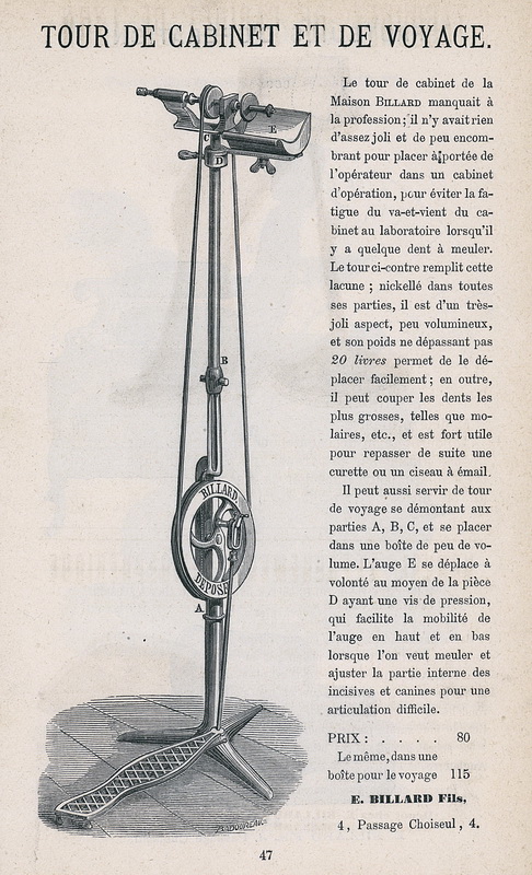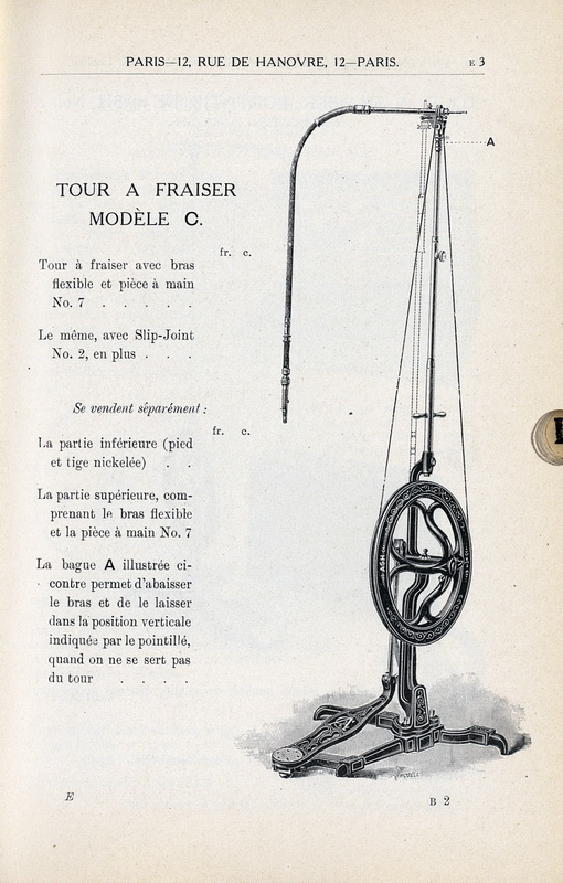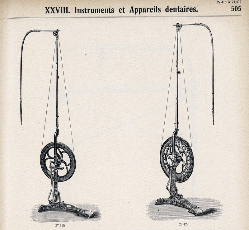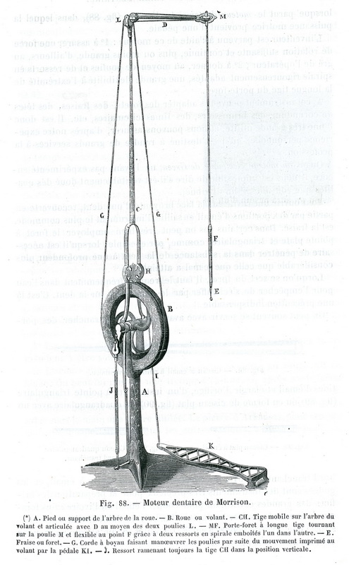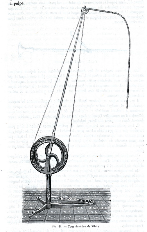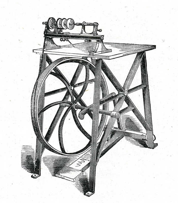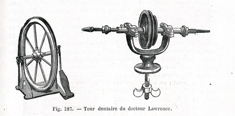 Tour à pédale de cabinet pour prothèses. Son volant à quatre branches, 1850-1880