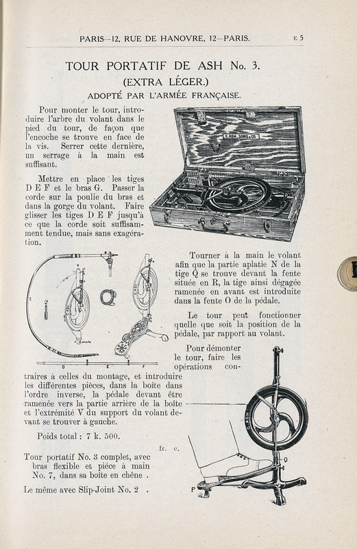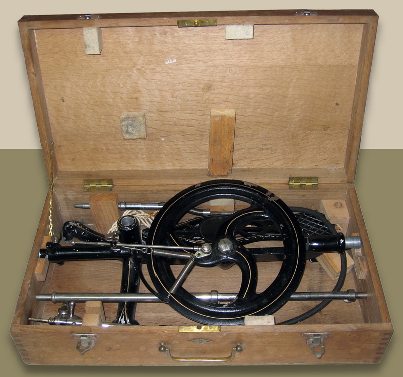 Tour à pédale portatif démonté, dans sa valise de transport. 1910. Marque S. S.