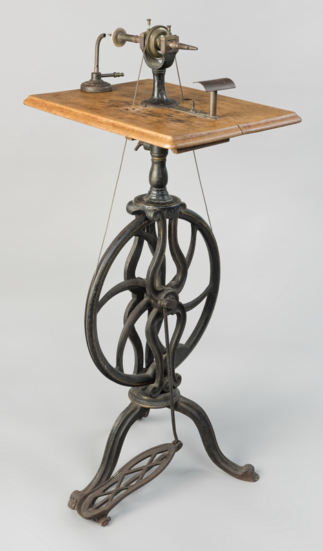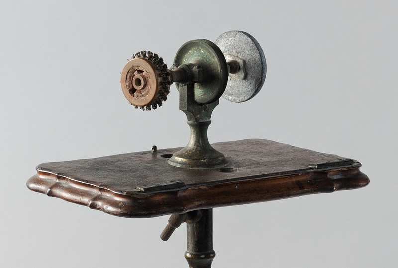 Tour à pédale de cabinet pour prothèse, 2ème moitié du XIXe s. (détail)) Tour à pédale de cabinet pour prothèse. Sa table de travail en bois avec sa roue supérieure dont l’axe est équipé d’une meule et d’une brosse, 2ème moitié du XIXe s.