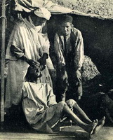 La tête du patient, couché à même la terre, est appuyée sur les genoux de