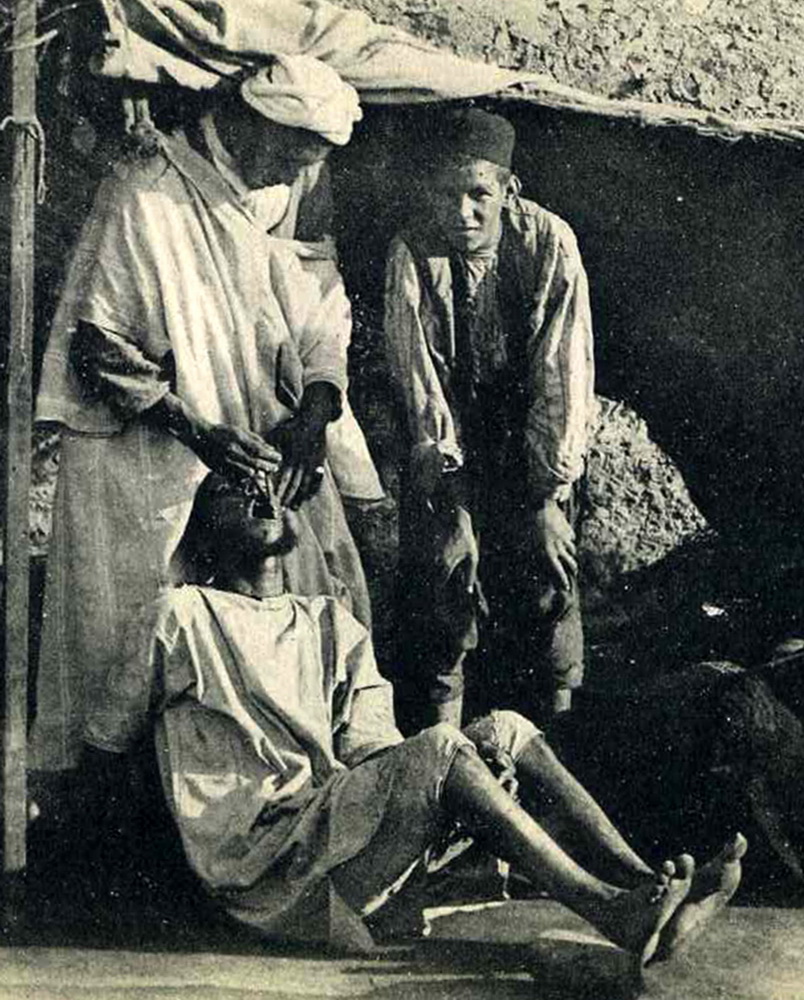 Le patient est assis sur un fauteuil en bois, la tête retenue par la