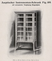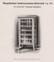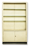 | Meuble aseptique, acier laqué crème, quatre portes en verre dépoli, vers